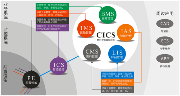 燃料智能管控系統(tǒng)CICS (Coal Intelligent Control & management System)是業(yè)務(wù)綜合處理系統(tǒng),包含BMS業(yè)務(wù)管理、TMS運(yùn)輸管理、CMS燃料管理、LIS樣品管理、IAS智能分析等各類業(yè)務(wù)處理子系統(tǒng)。另外,系統(tǒng)提供定制類的外圍擴(kuò)展應(yīng)用,如:管理駕駛艙CAD、電子商務(wù)ECS、移動(dòng)應(yīng)用APP等,以滿足管理決策、移動(dòng)辦公和市場(chǎng)采購(gòu)的智能化建設(shè)需要。
